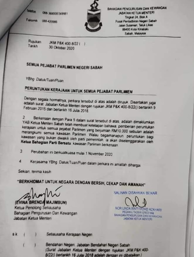 “Surat berkenaan memaklumkan arahan dikeluarkan oleh Ketua Menteri, Datuk Seri Panglima Hajiji Noor agar setiap satu bahagian diberikan RM10,000 sebulan bermula 1 November lalu.”