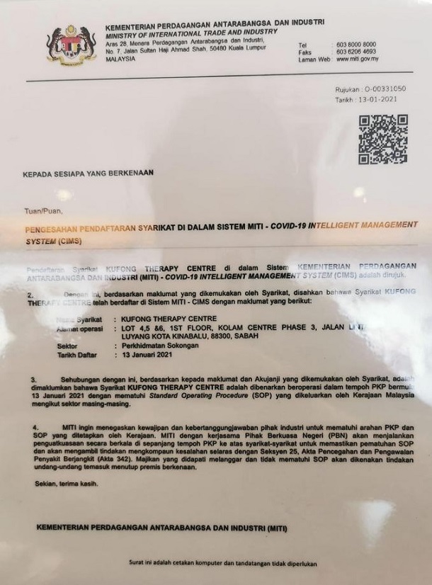 However, according to an image of an approval letter in social media, a chain of massage centres was registered under the “Perkhimatan Sokongan” or “Support Service” sector by MITI’s COVID-19 Intelligent Management System (CIMS) and therefore allowed to operate during MCO 2.0.